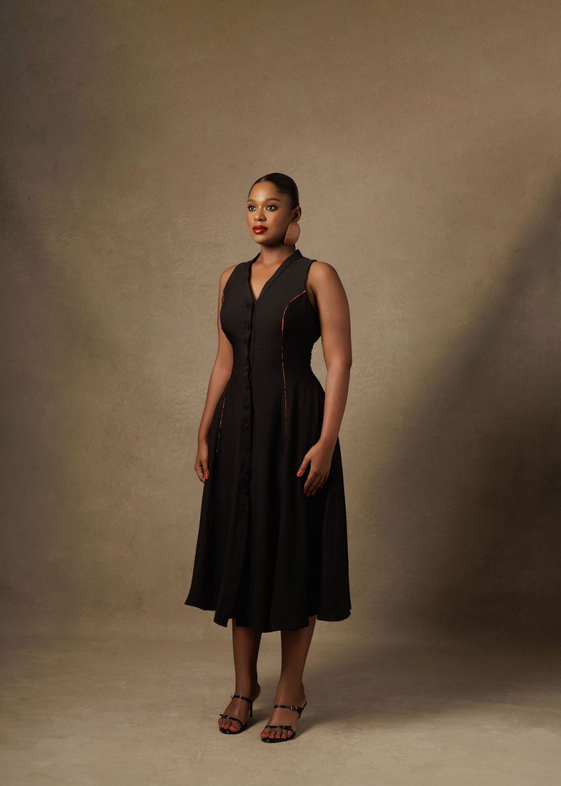 Zoe makes you fall in love with her. It’s a maxi dress with buttons running down to allow you decide how much coverage you want. It’s made from lightweight crepe with bold print.
